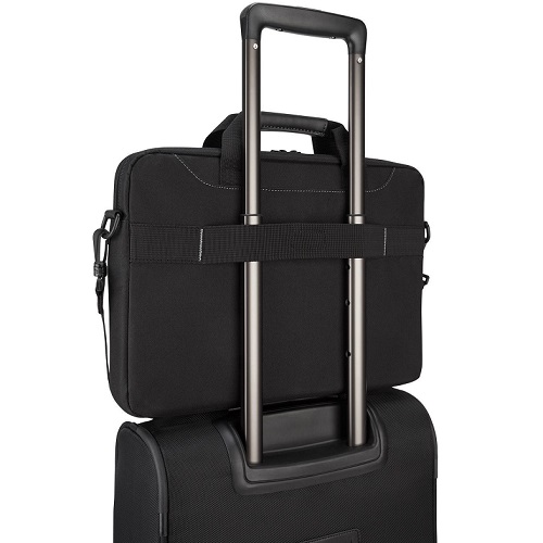 The Targus TSS898 Business Casual Slipcase Laptop Bag provides daily security for computers up to 15.6" with quick top load access, a padded laptop compartment, and simplified storage. The case is slimmer than a briefcase but roomier than a sleeve, with a retractable shoulder strap, soft-grip handles, and a trolley strap for attaching to your roller luggage for travel. A cushioned pocket inside safeguards your laptop and keeps paperwork or magazines close to reaching. In the zipped front pocket, store your charger, smartphone, and other devices. This lightweight, thin-profile case is distinguished by a durable fabric blend and contrast stitching. The Targus TSS898 Business Casual Slipcase Laptop Bag has no warranty.