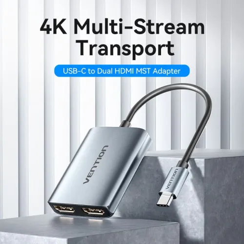 The Vention ACZHB Type-C to Dual HDMI Converter is designed for improving your display capabilities, making it ideal for professionals, content makers, and multitaskers. This Vention Type-C to HDMI Converter has a USB-C male interface on one end and dual HDMI female connectors on the other, allowing users to connect two HDMI-enabled monitors or displays simultaneously. The Vention ACZHB Type-C to Dual HDMI Converter supports both Single-Stream Transport (SST) and Multi-Stream Transport (MST) modes on Windows and macOS computers, allowing for smooth multi-screen configurations. Each HDMI connector supports 4K at 30Hz and 1080P at 60Hz resolutions, allowing users to experience crystal-clear visuals for business and enjoyment. When both HDMI ports are utilized simultaneously, the Vention ACZHB Converter produces a synchronized output of 4K at 30Hz or dual 1080P at 60Hz, which improves workflow and productivity. The Vention ACZHB Type-C to HDMI Converter is designed for longevity and performance, with a nickel-plated electroplating method to improve corrosion resistance and signal transmission. The housing is made of aluminum alloy and ABS, resulting in a sleek and durable design that can withstand regular wear. Internally, the Vention ACZHB Type-C to Dual HDMI Converter is made of tinned copper and has dual shielding—aluminum foil and graphene conductive fabric—to provide superior interference prevention and stable data transmission. The outer jacket is composed of high-quality PVC, ensuring flexibility and durability.
