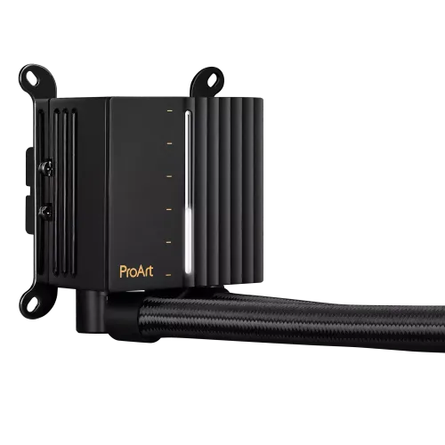 The ASUS ProArt LC 420 420mm All-In-One CPU Liquid Cooler is a powerful cooling solution designed for enthusiasts and professionals alike. Featuring a sleek and minimalist design, this liquid cooler seamlessly integrates into any setup, especially complementing the aesthetics of the ProArt-family components. The ProArt LC 420 boasts a trio of Noctua NF-A14 industrialPPC-2000 PWM 140mm radiator fans. These fans are engineered to deliver high airflow while maintaining minimal noise levels, ensuring efficient cooling without sacrificing peace. Powered by a performance three-phase motor, the cooler offers exceptional cooling capability with quieter operation, making it ideal for demanding tasks and extended usage. The ProArt LC 420 is its illuminated system status meter. This innovative addition provides real-time feedback on system load, temperatures, and fan speeds, allowing users to monitor performance at a glance. Coupled with 450mm of reinforced-sleeved tubing, this cooler offers both durability and flexibility, ensuring compatibility with various chassis configurations. The ProArt LC 420 features a thicker radiator with larger coolant storage, resulting in enhanced cooling performance even under heavy workloads or overclocking scenarios. Whether you're pushing your system to its limits or simply striving for optimal performance, this liquid cooler delivers reliable cooling to keep temperatures in check. The ASUS ProArt LC 420 420mm All-In-One CPU Liquid Cooler is a premium cooling solution that combines performance, durability, and aesthetics to meet the demands of discerning users.