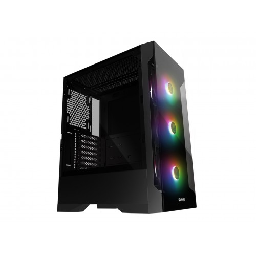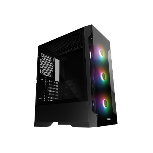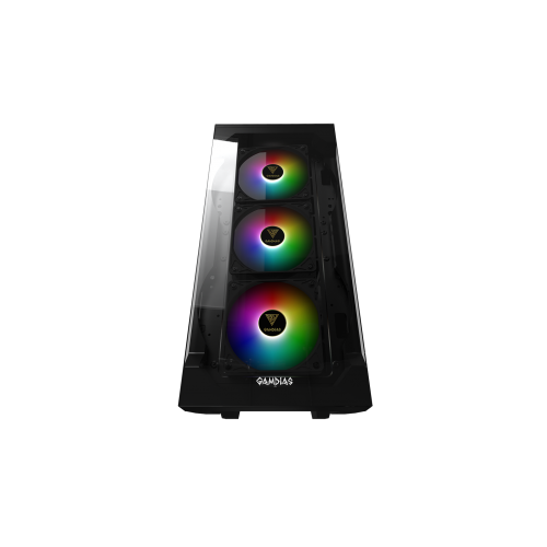 Gamdias TALOS E2 has mid tower case with front trapezoidal tempered glass panel, one left swing door.With a trapezoidal tempered glass allowing high air flow to the front, and RGB Fan lighting around the front, your PC case will look sleek and edgy. Sleek tempered glass panels fully display all components and lead the user to a brand new modding experience! TALOS E2 comes with one side swing door held closed, two built-in 120mm ring RGB fans. Not only showcasing all the components, also make modding easier and more convenient.TALOS E2 supports connection to compatible motherboards to achieve system-wide RGB lighting synchronization, makes you easier to unite your case from chaos to calm.To provide easy access and connectivity for all your devices, the top panel features a USB 3.0 and two USB 2.0 data ports as well as audio passthrough and the RGB fan lighting control switch.