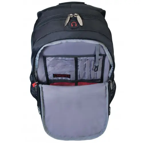 The Targus Terra Backpack is designed to protect up to 15.6" widescreen laptops. It is a compact, lightweight yet very robust backpack providing protection, functionality and comfort. The backpack features a built-in hidden rain cover and a water-resistant bottom to cater various weather conditions, including extreme humidity and rain. The laptop compartment and adjustable strap ensure a perfect fit for any laptop up to 15.6" W. The vertical front quick-access pocket is ideal to quickly grab the most needed items. The dual-side mesh pockets can hold a water bottle holder, an umbrella, or anything you want to easily have access to. The headphone porthole and connected MP3 player pocket guarantees you can enjoy your music on the go. The workstation will neatly store your keys, pens, business cards, and more. The padded back panel and contoured shoulder straps provide maximum comfort with functionality. Red accents give the backpack a stylish and discreet look. Your laptop, documents and digital accessories are perfectly well-protected. This means total peace of mind, even in extreme environments. Features of the bagpack are Designed to fit laptops up to 15.6�, Secret pocket at back panel, Built-in detachable rain cover, Snug fitted foam cradle laptop compartment, Features advanced accessory pockets, two water-bottle, pockets and a quick-access front pocket, Separate mesh pocket storage for your tablets or documents, Ergonomically designed to mold to your back and shoulders with padded back panel and shoulder straps, Soft neoprene handle for comfort, Constructed of durable 840D polyester with PU backing and Wear and Water-resistant bottom.