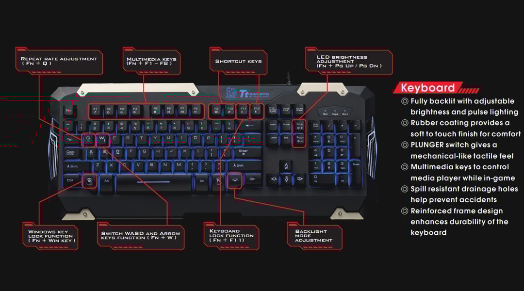The COMMANDER uses Tt Type II Plunger Switches with Mechanical keycaps giving users an awesome tactile feel and clicks with each keystroke while giving responsive feeling like using a mechanical switch keyboard. This will improve gaming performance by giving users speed and responsiveness like never before.