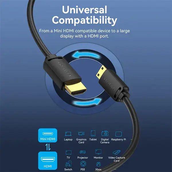 | Additional Info | Brand: Vention Name: Mini HDMI to HDMI Cable Model: AGH Color: Black Interface: Mini HDMI/HDMI Electroplating Process: Gold-Plated Resolution: 4K@60Hz Transmission Speed: 18Gbps Conductor: Bare Copper Shell: PVC Shielding: Aluminum Foil+Metal Braided+GND Jacket: PVC Wire Gauge: 32AWG OD: 5.2mm Length: 1.5 m Warranty: 1-Year Brand Warranty |