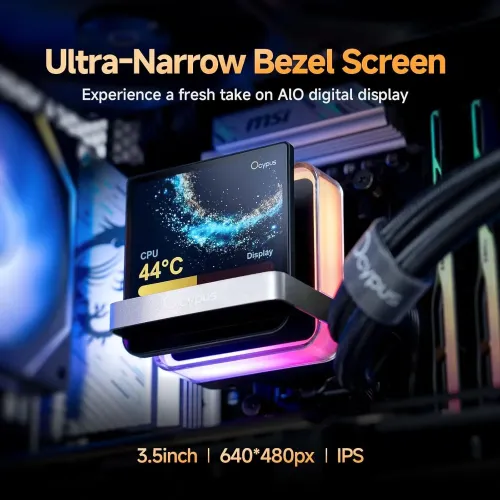 The Ocypus SIGMA L36 PRO BK 360mm AIO Liquid CPU Cooler combines advanced technology with stunning visual design for demanding PC enthusiasts. This Ocypus CPU Cooler features an impressive 3.5-inch square IPS screen integrated into the pump head, offering a vibrant 640 by 480 pixel resolution with ultra-narrow bezels that display real-time system information. The innovative display supports multiple content formats, including videos, images, and GIFs, allowing users to personalize their cooling system creatively. Built with a floating design and bright silver frame, the Ocypus SIGMA L36 PRO BK 360mm CPU Cooler adds remarkable visual depth while utilizing precision magnetic mounting for effortless installation and rotation. At the heart of this Ocypus SIGMA L36 PRO BK AIO CPU Cooler lies an advanced ceramic bearing architecture featuring 0.1mm microchannels paired with an ultra-large 3700 square millimeter copper base, delivering consistently high-efficiency heat dissipation with an impressive 310W TDP rating. The Ocypus SIGMA L36 PRO BK CPU Cooler includes three high-performance PWM fans equipped with fluid dynamic bearings that operate between 500 and 2400 RPM, producing up to 90 CFM airflow and 5.8mmH2O air pressure. For users seeking quieter operation, the included speed reduction cable lowers fan speeds to 2000 RPM, reducing noise levels from 36 decibels to just 29 decibels. This Ocypus Liquid CPU Cooler supports broad compatibility with Intel LGA 115X, 1200, 1700, and 1851 sockets, along with AMD AM4 and AM5 platforms. The Ocypus SIGMA L36 PRO BK 360mm Liquid CPU Cooler has customizable ARGB ring enables users to select various colors and dynamic lighting effects, synchronizing seamlessly with other devices. With 400mm flexible tubing and aluminum radiator construction, the Ocypus CPU Cooler provides excellent installation flexibility while maintaining optimal thermal performance for extended periods.
