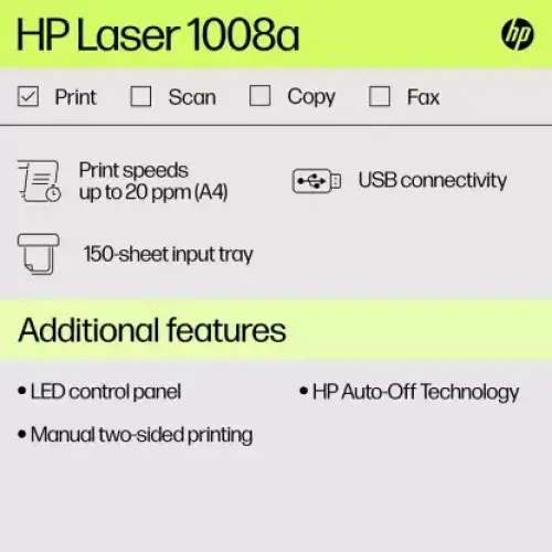 The HP Laser 1008a Single Function Mono Laser Printer helps you save electricity by automatically shutting down when not in use for HP Auto-down technology.