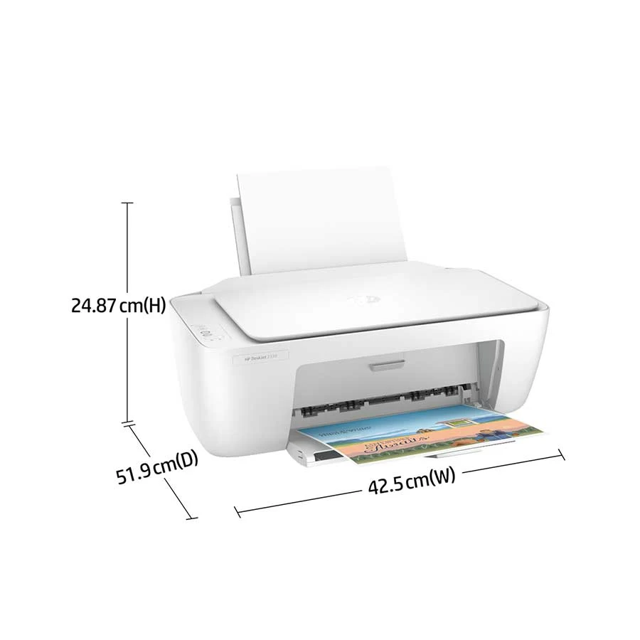 Brand - HP, Model - HP DeskJet 2330, Series - DeskJet, Functions - Print, Scan, Copy, Printer Type - Multifunction Color INK Printer, Output Color - Color, Print Technology - Ink, First Page Print - 15sec (Black), 18sec (Color), Print Speed (Black) - 7.5ppm(ISO) (A4), 20ppm(Draft) (A4), Print Speed (Color) - 5.5ppm(ISO) (A4), 16ppm(Draft) (A4), Print Resolution (Pixel) - 1200 x 1200 dpi, Printer Resolution (Black) - 1200 x 1200 dpi, Duplex Print - Manual, Standard Print Languages - HP PCL 3 GUI, Scanner Type - Flatbed, Scan Resolution (Pixel) - 1200 x 1200 dpi, Scan Paper Size - Letter, A4, Scan Paper Size Max. (Inch) - 8.5 x 11.69, Duplex Scan - No, Scan Features - Scan File Format: JPEG, TIFF, PDF, BMP, PNG, Copy Speed - 6 cpm, Copy Resolution (Pixel) - 600 x 300 dpi, Print Paper Size Minimum - A6, Print Paper Size Max. - legal, Print Paper Size Max. (Inch) - 8.5 x 14, Duplex Print Paper Size Max. - Not Applicable, Max. Paper Size Custom - Legal (215.9 x 355.6mm), Print Paper Size - A4, B5, A5, A6, DL envelope, Letter, legal; 4 x 6 in, 5 x 7 in, 8 x 10 in, No. 10 envelopes, Paper Weight - 75gsm, Paper Type - Plain paper, photo paper, brochure paper, Input Tray - 60 Sheets, Output Tray - 25 Sheets, ADF - No, Printer Memory - 128MB (SDRAM), 32MB (Flash), Interface (Built-in) - USB, Mobile Device Printing - No, Mobile Printing - No, Borderless Printing - No, OS Compatibility - Windows 11, Windows 10, Windows 7, macOS 10.12 Sierra, Monthly Duty Cycle - 1000 Pages, Recommended Monthly Print Volume - 100 Pages, Consumable - HP 805 Black (120 pages yield) 3YM73AA; HP 805XL High Yield Black (240 pages yield) 3YM71AA; HP 805 Tri-color (100 page yield) 3YM72AA; HP 805XL Tri-Color High Yield (200 page yield) 3YM70AA. HP 805 Black (120 page yield) 3YM73AA; HP 805XL High Yield Black (240 pages yield) 3YM71AA; HP 805 Tri-color (100 page yield) 3YM72AA; HP 805XL Tri-Color High Yield (200 page yield) 3YM70AA. HP 805 Black (120 page yield) 3YM73AA; HP 805XL High Yield Black (240 pages yield) 3YM71AA; HP 805 Tri-color (100 page yield) 3YM72AA; HP 805XL Tri-Color High Yield (200 page yield) 3YM70AA. HP 805XL Tri-Color High Yield (200 page yield) 3YM70AA. HP 805XL Tri-Color High Yield (200 page yield) 3YM70AA. (Actual yields vary considerably based on content of printed pages and other factors.), Number of Cartridges Required - 2, Number of Black Cartridges Included - 1, Number of Color Cartridges Included - 1, Body Color - White, Power Source/ Power Consumption - 0.05 watts (off), 1.83 watts (ready), 0.83 watts (sleep), 0.05 watts ( auto-off), Dimensions (WxHxD) - 425 x 249 x 370 (Minimum), 425 x 249 x 523.8mm (Maximum), Weight (Kg) - 3.42 Kg, Others - Color print quality (best): Up to 4800 x 1200 optimized dpi color resolution (when printing from a computer on HP photo paper and 1200 input dpi). Connectivity, standard: 1 Hi-Speed USB 2.0, Included Components - HP DeskJet 2330 All-in-One printer; HP 805 Setup Black Cartridge; HP 805 Setup Tri-color Cartridge; Regulatory flyer; Setup guide; Reference guide; Power cord [For ink volume and page yield information, visit http://hp.com/go/learnaboutsupplies], Warranty - 1 Year (Without Adapter), Country of Origin - USA, Made in/ Assemble - China/Vietnam/Philippines/Japan