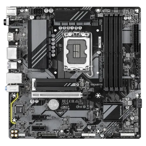 The GIGABYTE B760M DS3H WIFI6E GEN5 mATX Motherboard is a powerful and compact option for gamers, creators, and professionals seeking modern capabilities without sacrificing stability or performance. Built with the Intel B760 Express chipset, it supports 14th, 13th, and 12th Generation Intel Core, Pentium Gold, and Celeron CPUs via the LGA1700 socket, making it ideal for a variety of designs. Memory support is future-ready, with four DDR5 DIMM ports supporting up to 256GB capacity and overclocking rates of up to DDR5-7600 when combined with high-end processors. The GIGABYTE B760M DS3H WIFI6E GEN5 Motherboard also supports dual-channel architecture, ECC and non-ECC modules, and Intel XMP profiles for smooth overclocking. Graphics are handled by integrated Intel HD Graphics, which supports HDMI 2.1 with resolutions of up to 4K at 60Hz and multiple DisplayPort outputs, allowing for triple-display setups for productivity and enjoyment. The Realtek codec improves audio quality by enabling up to 7.1-channel HD sound with S/PDIF output, providing an immersive experience. With Realtek 2.5GbE LAN and Intel Wi-Fi 6E AX210 module, the GIGABYTE B760M DS3H WIFI6E GEN5 Motherboard provides Wi-Fi 6E connection across 2.4GHz, 5GHz, and 6GHz bands, as well as Bluetooth 5.3 for current wireless devices. Storage options include two M.2 PCIe 4.0 x4 connectors for NVMe SSDs and four SATA 6Gb/s ports with RAID 0, 1, 5, and 10 support, allowing for high-speed and redundant storage configurations. Expansion is robust, with one PCIe 5.0 x16 port for next-generation GPUs and two PCIe 3.0 x1 slots for add-on cards. The GIGABYTE B760M DS3H WIFI6E GEN5 Motherboard's rear panel features USB 3.2 Gen2 Type-C, USB 3.2 Gen1, USB 2.0, HDMI, DisplayPort, RJ-45 LAN and audio ports, as well as Wi-Fi antenna connectors. Other features include RGB and ARGB headers, Q-Flash Plus for simple BIOS updates, fan monitoring, Smart Backup, and support for GIGABYTE Control Center software. With Windows 10 and 11 compatibility and a micro ATX form factor of 24.4cm x 24.4cm, the GIGABYTE B760M DS3H WIFI6E GEN5 is a dependable motherboard that combines performance, connectivity, and expandability for modern PC designs.